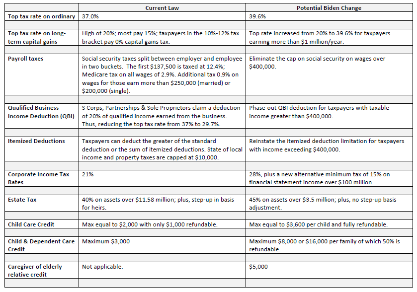 Without the benefit of a formal lineup card, the expected Biden field will be set with potential sweeping changes to the existing Trump tax cuts of 2017. Here are a few that that Team Biden is considering: